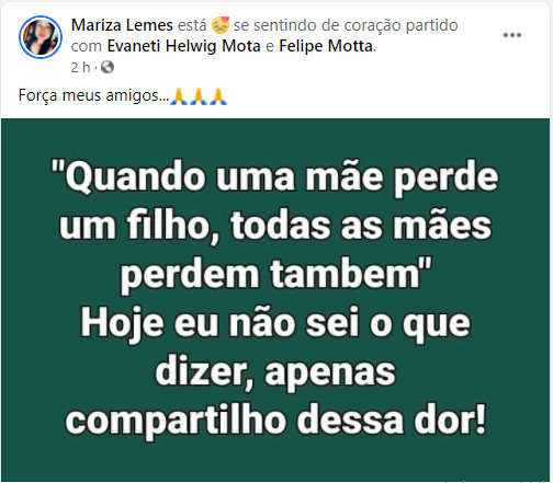 Ainda na manhã deste sábado (20), a mãe de Tairan Farias, Evaneti Helwig Mota postou uma mensagem de esperança em seu perfil do Facebook, veja:
