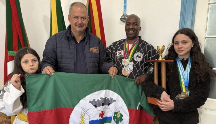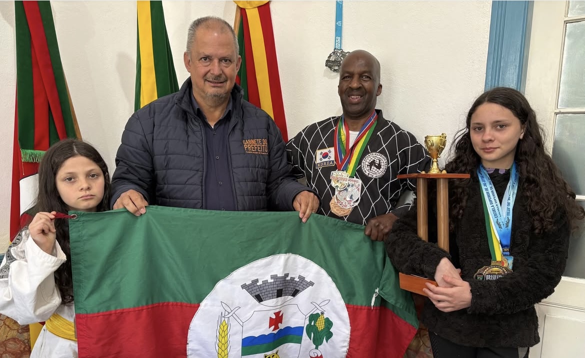 Na manhã desta sexta-feira (26), o prefeito de Canguçu, Arion Braga, recebeu em seu gabinete o Mestre Nunes e as alunas Anthonyele, Angelyna e Lorraine, que se destacaram em um evento internacional de taekwondo realizado no último dia 14 de setembro, em Rio Branco, no Uruguai. A competição foi organizada pelo Grão-Mestre Jorge Senna e pela Mestra Giovana e reuniu atletas de diversas regiões.