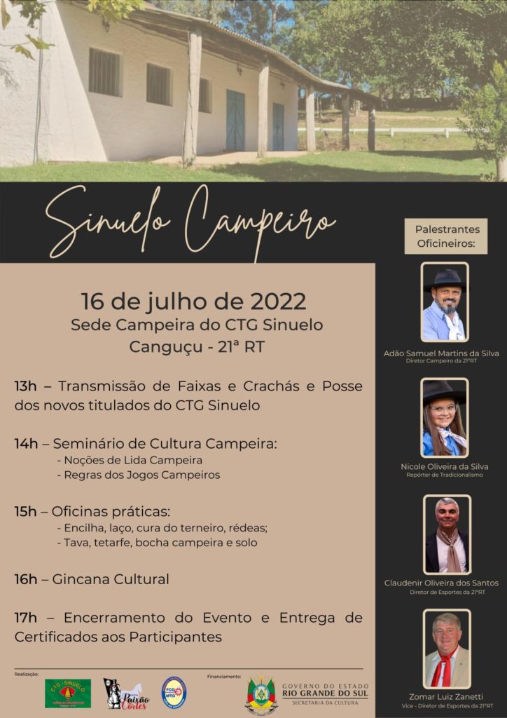 O Centro de Tradições Gaúchas Sinuelo estará realizando um dia de campo em sua sede campeira, em Canguçu. O evento acontece no próximo dia 16 de julho, a partir das 13h. Entre as atividades, devem acontecer palestras e oficinas ligadas às tradições gaúchas. A participação é aberta ao público, sem necessidade de pagamento de entrada. Aos participantes, serão disponibilizados certificados pelas atividades.