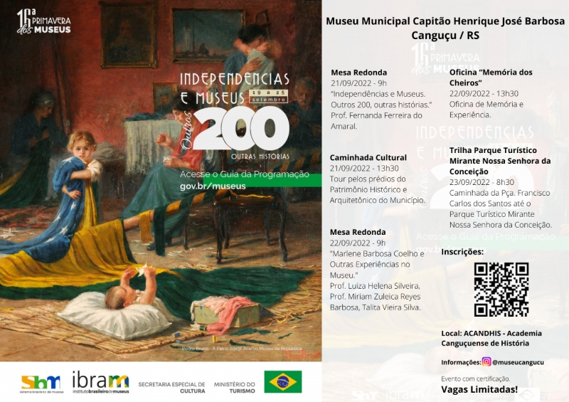 Acontecerá, na próxima quarta (20) a a 16ª Primavera dos Museus. Evento realizado pela Prefeitura e Museu Municipal Capitão Henrique José Barbosa se estende até sexta (23). As atividades serão realizadas na Academia Canguçuense de História (ACANDHIS) e contará com oficinas, contos sobre a história da independência, tour pelos prédios do patrimônio histórico de Canguçu, caminhadas e mesa redonda.