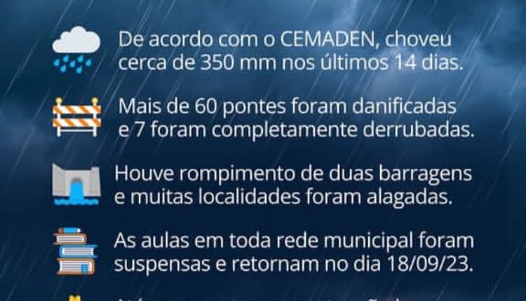 De acordo com a Secretaria de Infraestrutura Rural, 60 pontes tiveram danos na estrutura e 7 foram derrubadas. Com o registro de alagamentos, estruturas de bueiros e estradas apresentaram problemas. Duas barragens no Assentamento Renascer romperam, o que ocasionou prejuízos. As equipes da Prefeitura monitoram a situação e auxiliam os moradores.