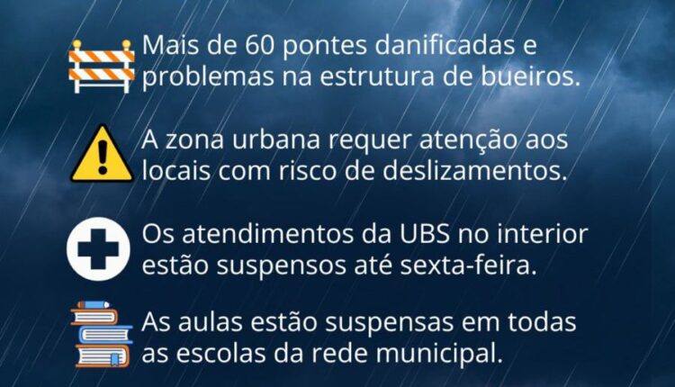 As aulas estão suspensas em toda a rede municipal de ensino, conforme divulgado mais cedo. Já a Secretaria de Saúde reitera que os serviços de saúde na cidade contam com atendimento normal, mas na zona rural está suspenso o atendimento das UBS até sexta-feira (15).