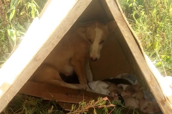De acordo com Adir, a cadelinha deu a luz a 7 filhotes e estava com os pequenos em um terreno no Lote João jorge, Rua 3 quando Adir foi até o local e construiu um abrigo improvisado para não deixar os filhotes expostos ao frio e o calor, e está levando alimentos até o local.