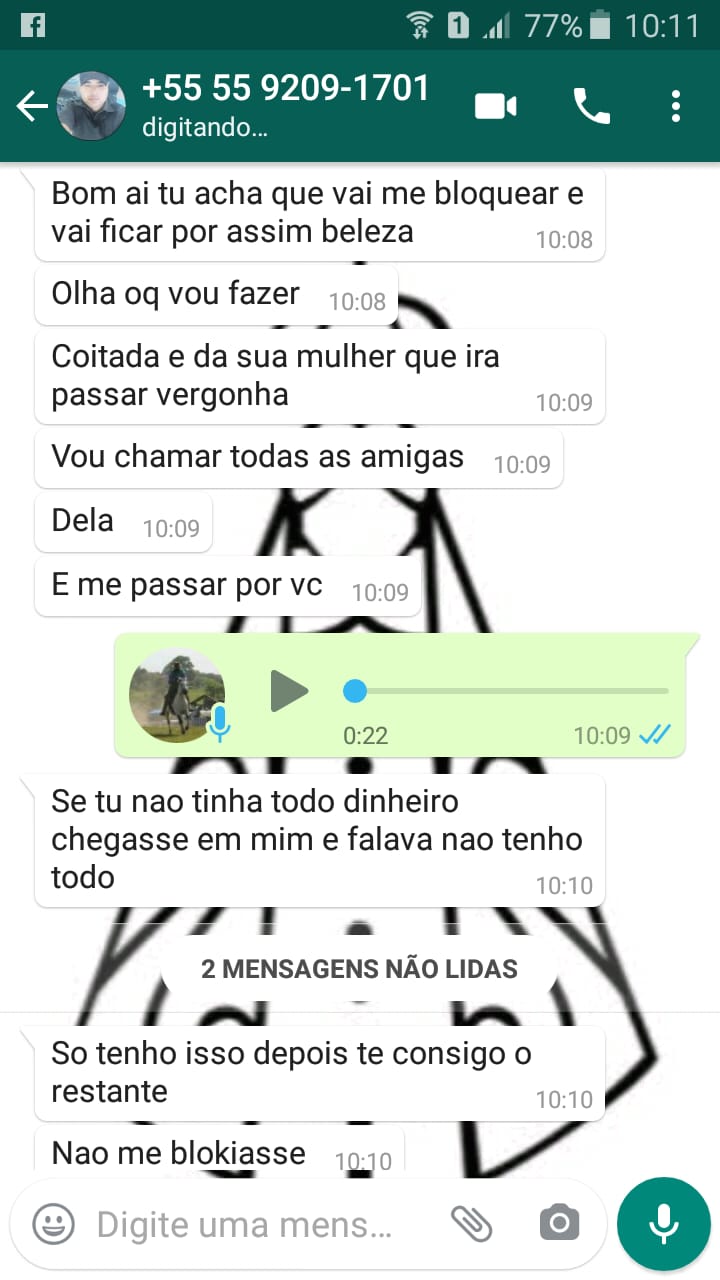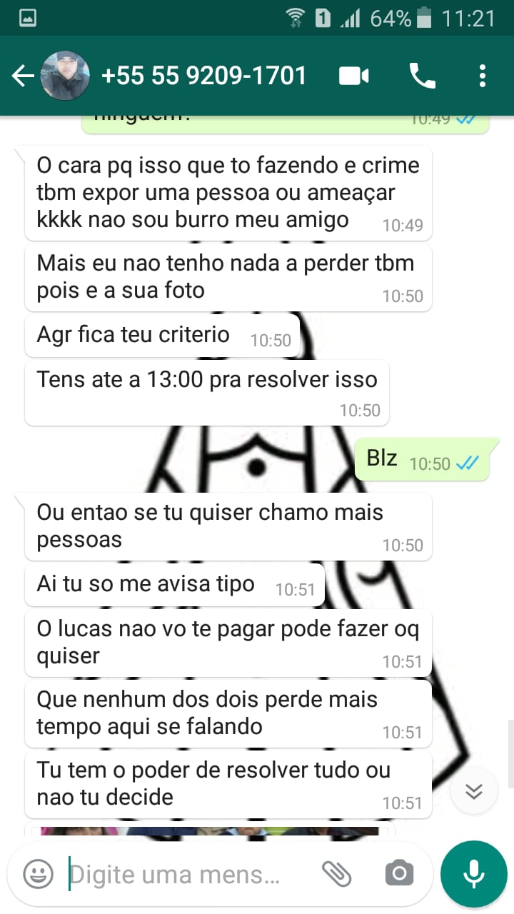 – Quero relatar algo que aconteceu comigo no último final de semana para que outras pessoas saibam que aqui em Canguçu existem pessoas ameaçando e aplicando golpes. Uma pessoa entrou em contato comigo pelo WhatsApp dizendo que eu tinha entrado em contato com uma suposta irmã dele que era menor de idade, e após isso começou a pedir dinheiro no valor de R$ 2 mil e que eu deveria depositar até o  meio dia,  se não ele ia divulgar fotos minhas em grupos e redes sociais. Não sei como essa pessoa consegui meu número!