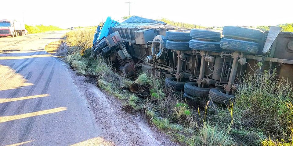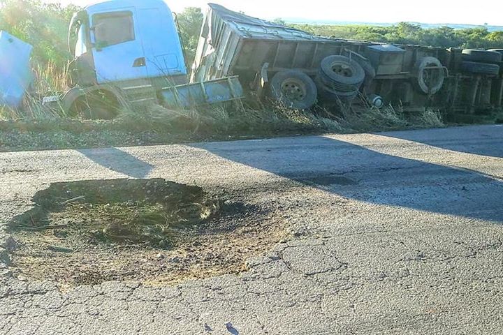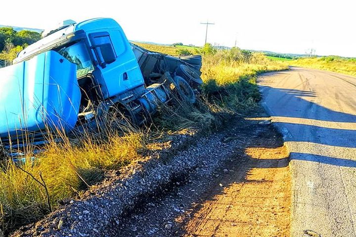 O leitor Paulo Renato Voese Prestes registrou na manhã desta terça-feira (14), na ERS-471, uma saída de pista seguida de capotamento de uma carreta carregada de adubo que trafegava pela ERS no sentido Canguçu – Encruzilhada do Sul mais precisamente no quilômetro 252, e ao passar por um enorme buraco no asfalto não conseguiu manter o controle e acabou saindo da pista.
