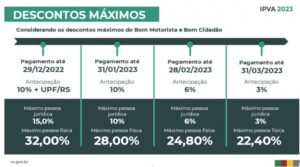 Os descontos para bons motoristas estão mantidos, como nos anos anteriores, e variam em três faixas, conforme o período sem infrações cometidas no trânsito. Para os condutores que não tiveram registro de infrações nos sistemas de informações do Estado entre 1º de novembro de 2019 e 31 de outubro de 2022 (três anos), a redução será de 15%.