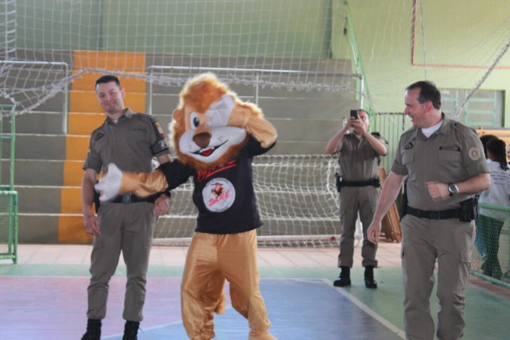 O Leão Dare, mascote do PROERD, era a atração mais esperada do evento e chegou de surpresa animando as crianças.