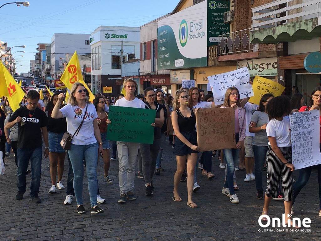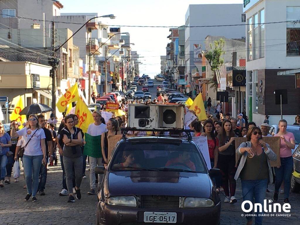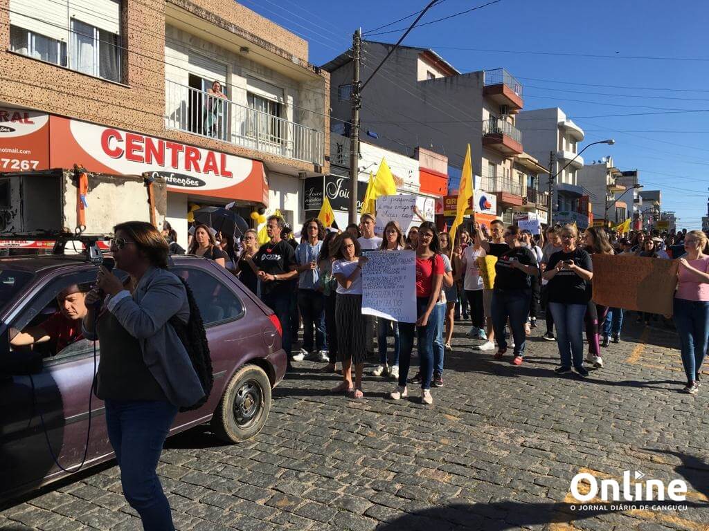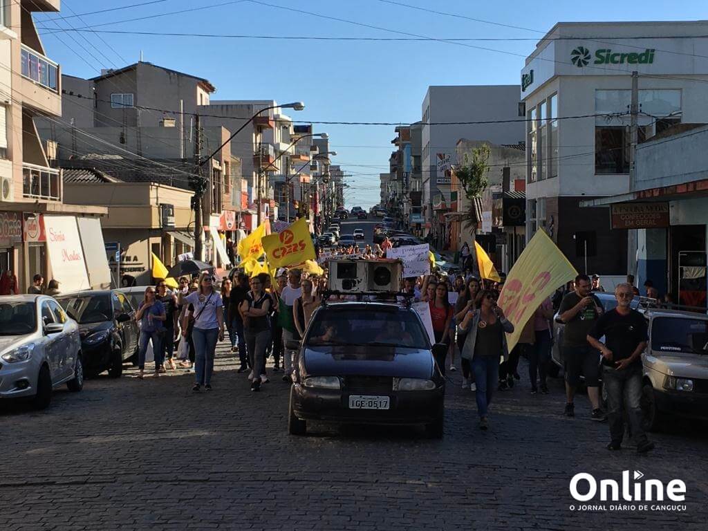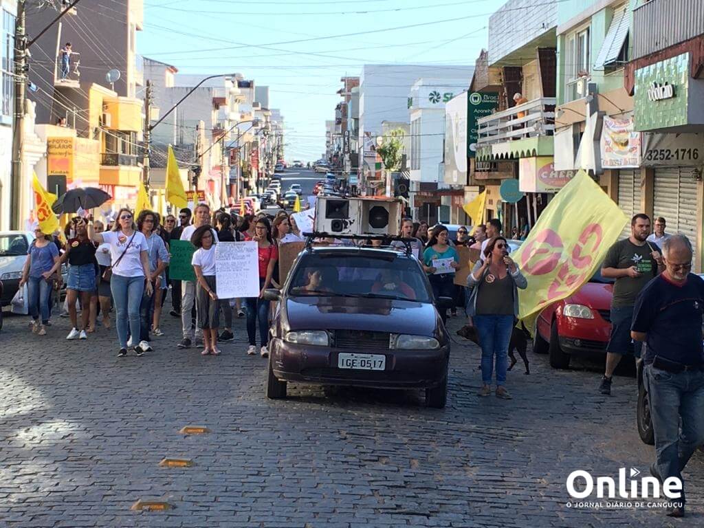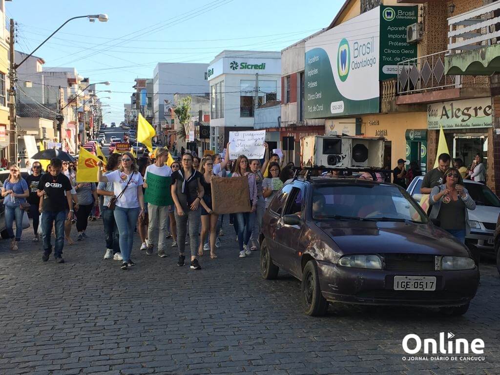 Professores fizeram uma caminhada nesta quinta-feira (28), no Centro de Canguçu, em favor da educação em escola pública e contra o pacote de medidas enviadas pelo Governo do Estado que altera a carreira do Magistério.