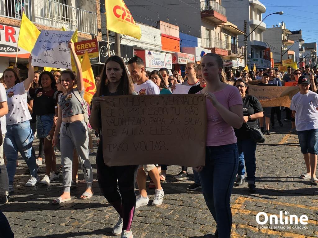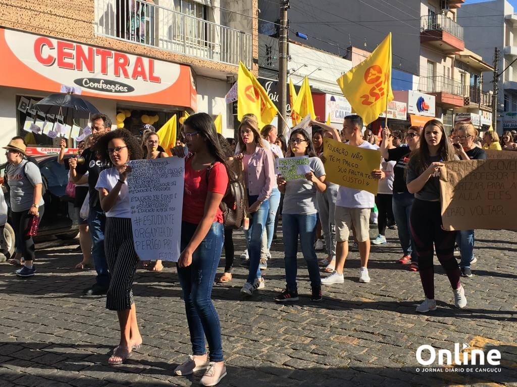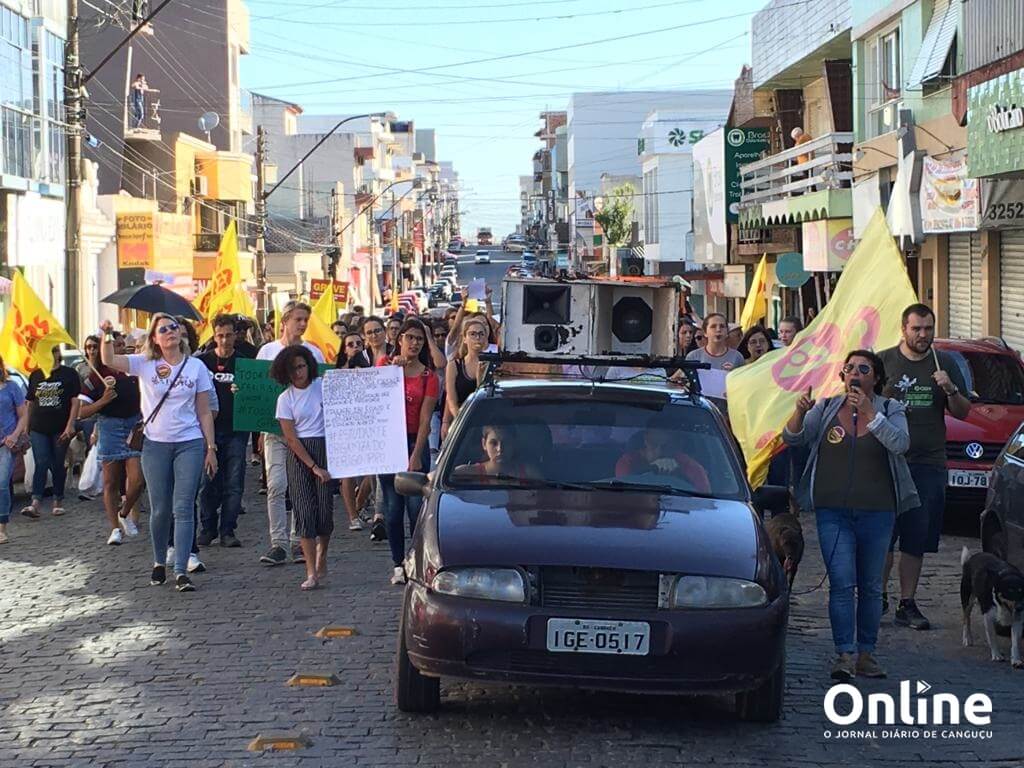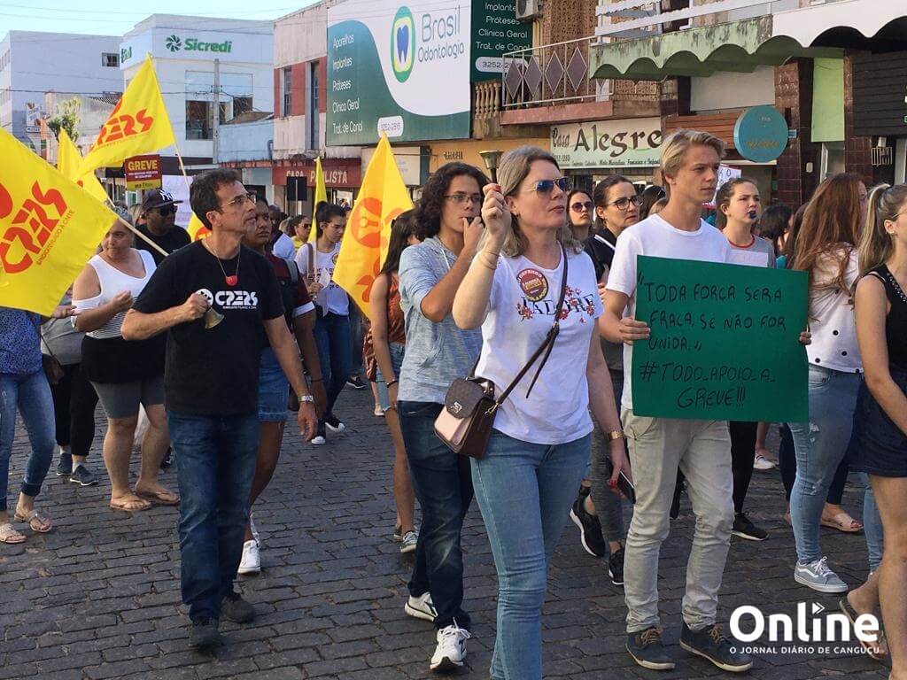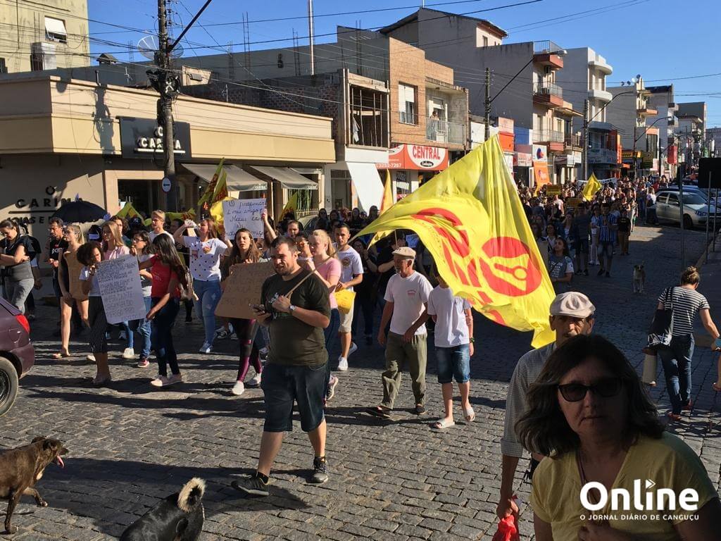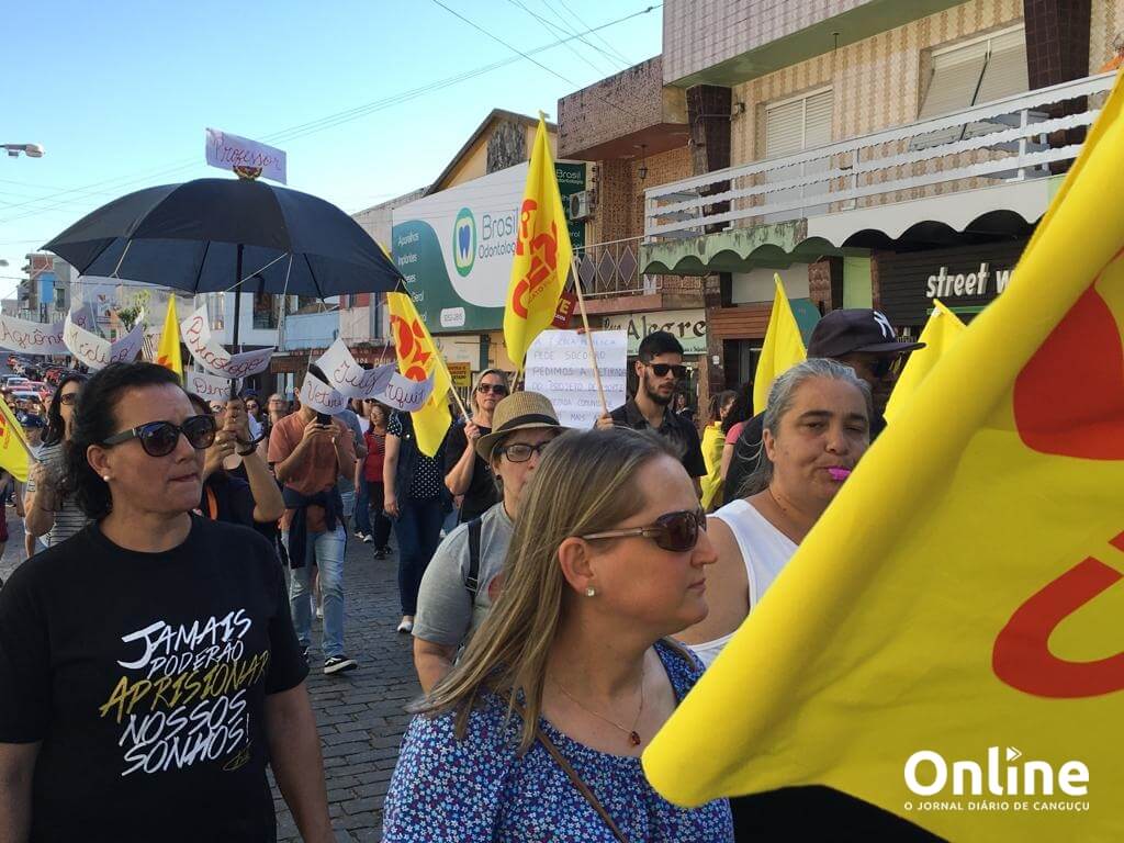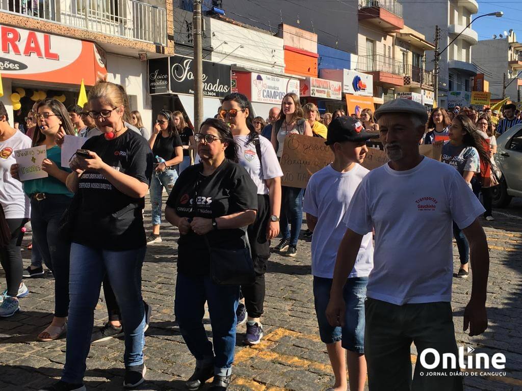 Professores fizeram uma caminhada nesta quinta-feira (28), no Centro de Canguçu, em favor da educação em escola pública e contra o pacote de medidas enviadas pelo Governo do Estado que altera a carreira do Magistério.