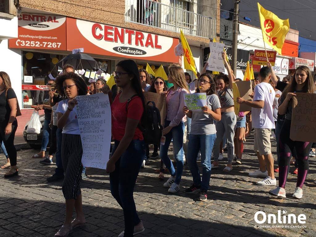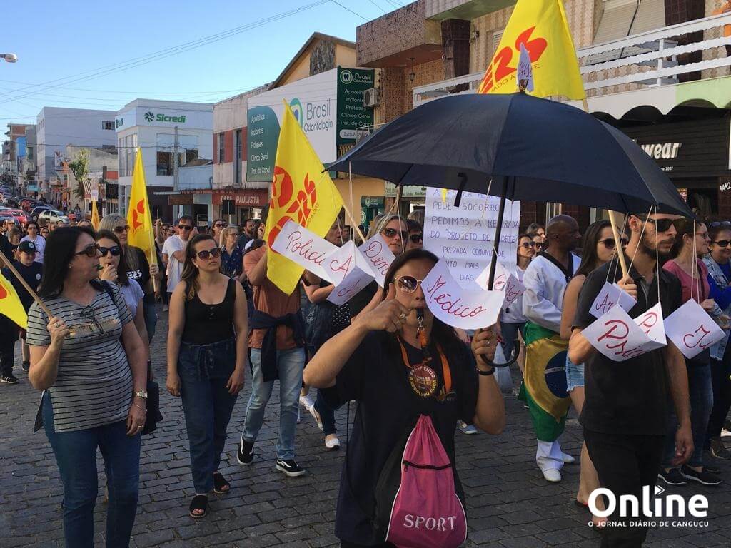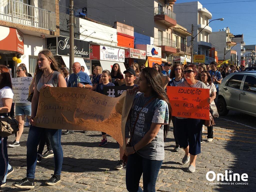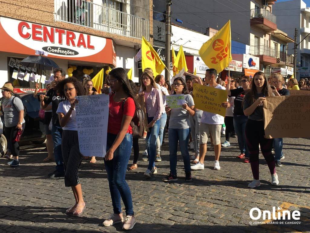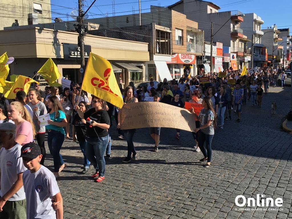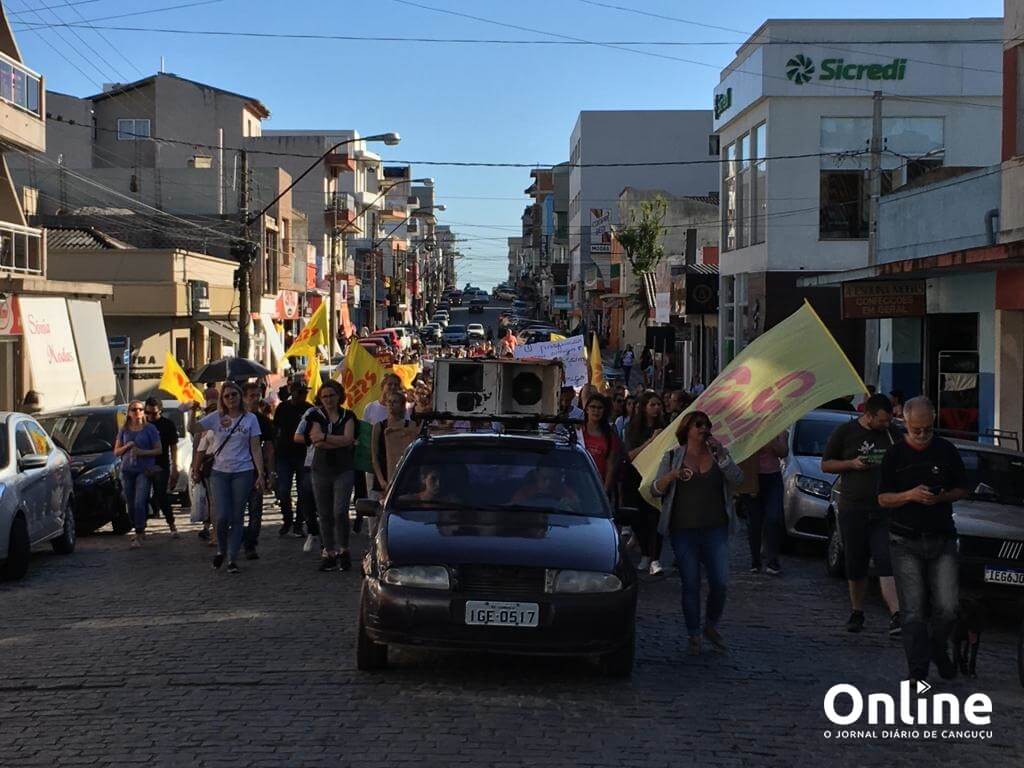 Professores fizeram uma caminhada nesta quinta-feira (28), no Centro de Canguçu, em favor da educação em escola pública e contra o pacote de medidas enviadas pelo Governo do Estado que altera a carreira do Magistério.