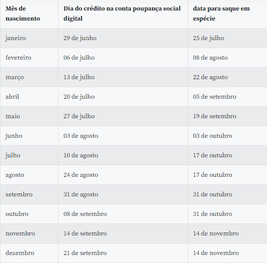 O dinheiro só será liberado para saque ou transferência para outra conta bancária a partir de 31 de outubro, para os trabalhadores nascidos nesse mês. O calendário de crédito na conta poupança digital e de saques foi estabelecido com base no mês de nascimento do trabalhador.