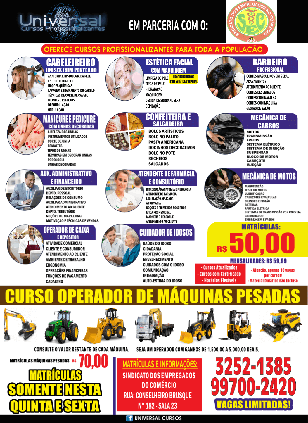 A Universal Cursos, em parceria com o Sindicato dos Empregados do Comércio de Canguçu (SINDEC), oferecem os seguintes cursos para a cidade e a região.
