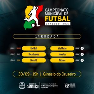 Acontecerá nesta quinta-feira (30) a retomada do Campeonato Municipal de Futsal 2021, em Canguçu. Os jogos serão realizados no Ginásio do Esporte Clube Cruzeiro, a partir das 19h, com a adoção de todos os protocolos necessários para o período. Confira as equipes que irão disputar a primeira rodada.