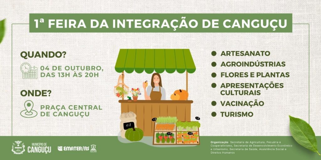 Vem aí a 1ª Feira de Integração Canguçu. O evento ocorre na próxima terça (4), das 13h às 20h, na Praça Central. As festividades organizadas pela Prefeitura e apoiadores contarão com exposição e comercialização de artesanato, produtos orgânicos, bebidas artesanais, plantas, flores e diversas outras produções realizadas no município.