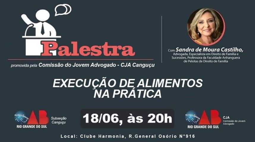 A palestra será ministrada pela professora Sandra de Moura Castilho e terá como tema a Execução de Alimentos na Prática. O evento é gratuito e acontece nesta terça-feira (18), às 20h, no Clube Harmonia. Será fornecido certificado de participação com 4 horas complementares.