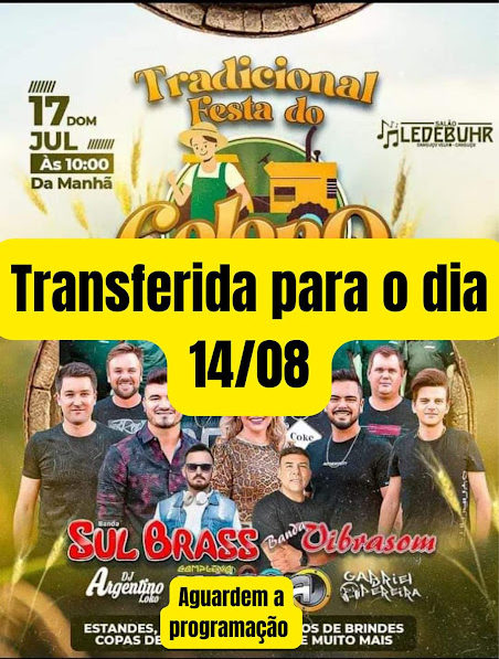 Denominada Festa do Colono e Motorista do Salão Ledebuhr, a edição de 2022 será a primeira desde a interrupção dos eventos por conta da pandemia. A nova programação ainda será divulgada. Conforme Canguçu Em Foco, quaisquer dúvidas poderão ser sanadas em pelo WhatsApp (53) 99713-9234.