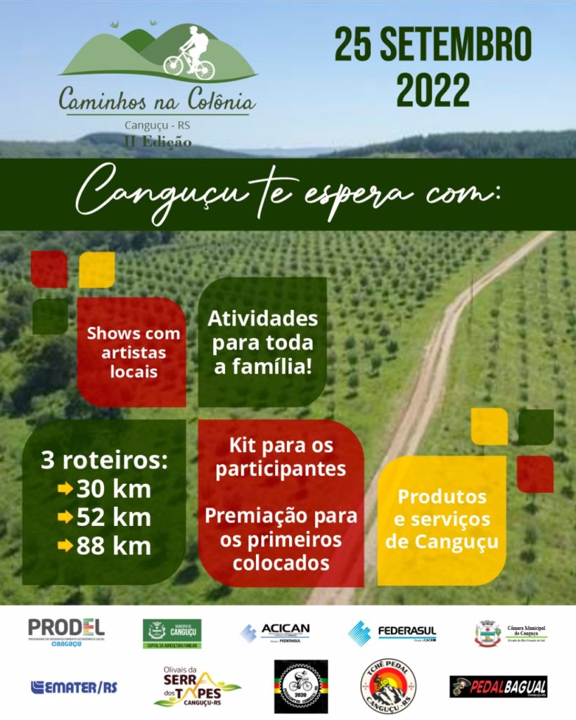 Estão abertas as inscrições para o 2ª Desafio Caminhos na Colônia de Canguçu. O evento ciclístico acontecerá no município em 25 de setembro deste ano. Serão três roteiros, pelas estradas rurais e urbanas, de 30km, 52km e 88km que prometem surpreender os visitantes com as belezas da Serra dos Tapes.