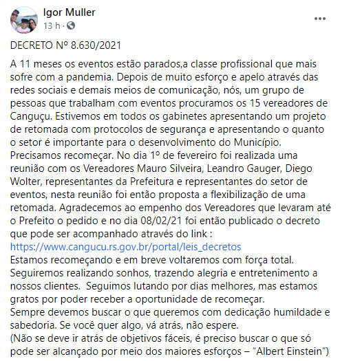 Um dos componentes do grupo do setor de eventos, Igor Müller, postou em seu perfil do Facebook o decreto assinado pelo prefeito Vinícius Pegoraro e também um agradecimento em seu nome e no nome do grupo de empresários e autônomos que dependem diretamente dos eventos para manterem sua renda.