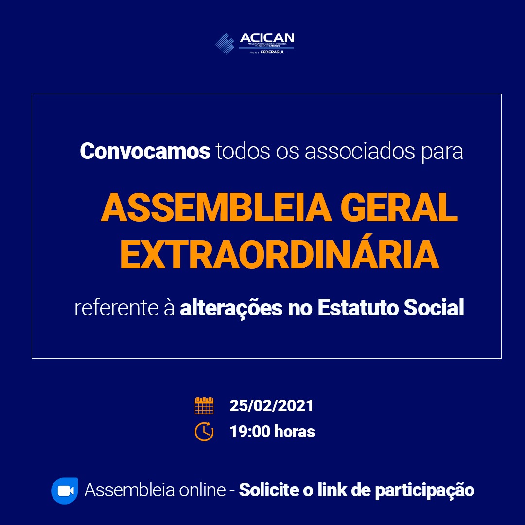 A Presidente da Associação do Comércio Indústria, Serviços e Agronegócio de Canguçu – (ACICAN), Elisa Bettin no uso de suas atribuições, convoca todos os associados para participar da Assembleia Geral Extraordinária, que será realizada no próximo dia 25 de Fevereiro de 2021, as 19h0 de forma online através da plataforma zoom.