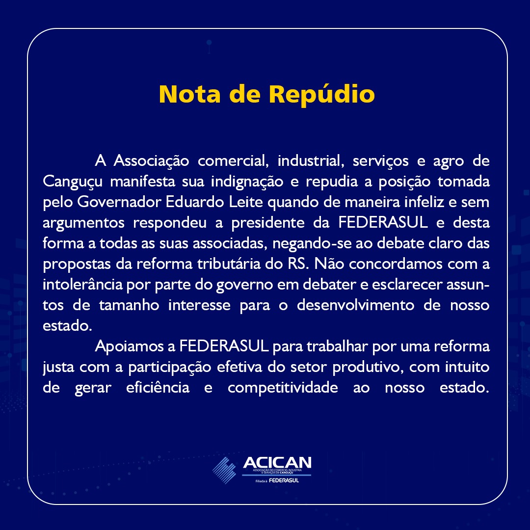 A Associação Comercial, Industrial, Serviços e Agro de Canguçu (ACICAN) divulgou uma nota de repúdio contra uma resposta do governador do Rio Grande do Sul, Eduardo Leite, a uma pergunta feita pela presidente da Federasul, Simone Leite.