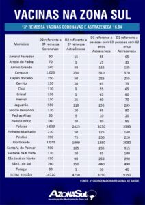 A Associação dos Municípios da Zona Sul (Azonasul) emitiu uma nota em que informa a quantidade de vacinação do próximo lote para a região.