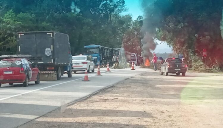 Os manifestantes, às 10h e 13 minutos, bloqueiam a rodovia totalmente