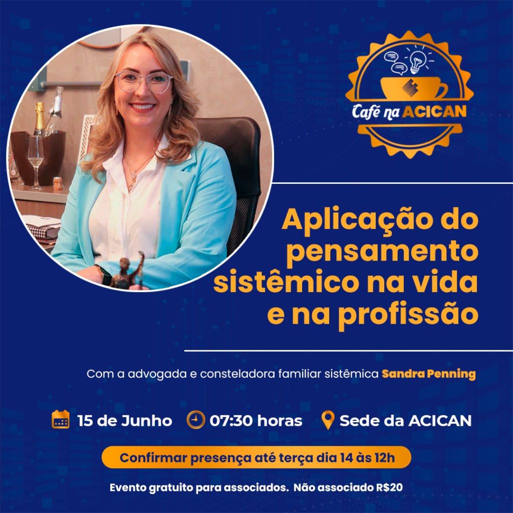 O encontro ministrado pela advogada tem como tema a aplicação do pensamento sistêmico na vida e na profissão. Para participar do evento, é preciso confirmar presença até às 16h desta terça-feira (14). Os associados da Acican não terão custos para participar e os demais poderão comparecer mediante investimento de R$ 20.