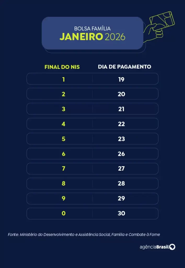 A Caixa Econômica Federal começa a pagar a parcela de janeiro do Bolsa Família. Recebem nesta segunda-feira (19) os beneficiários com Número de Inscrição Social (NIS) de final 1. Ao todo cerca de 18,8 milhões de famílias receberão o benefício neste mês.