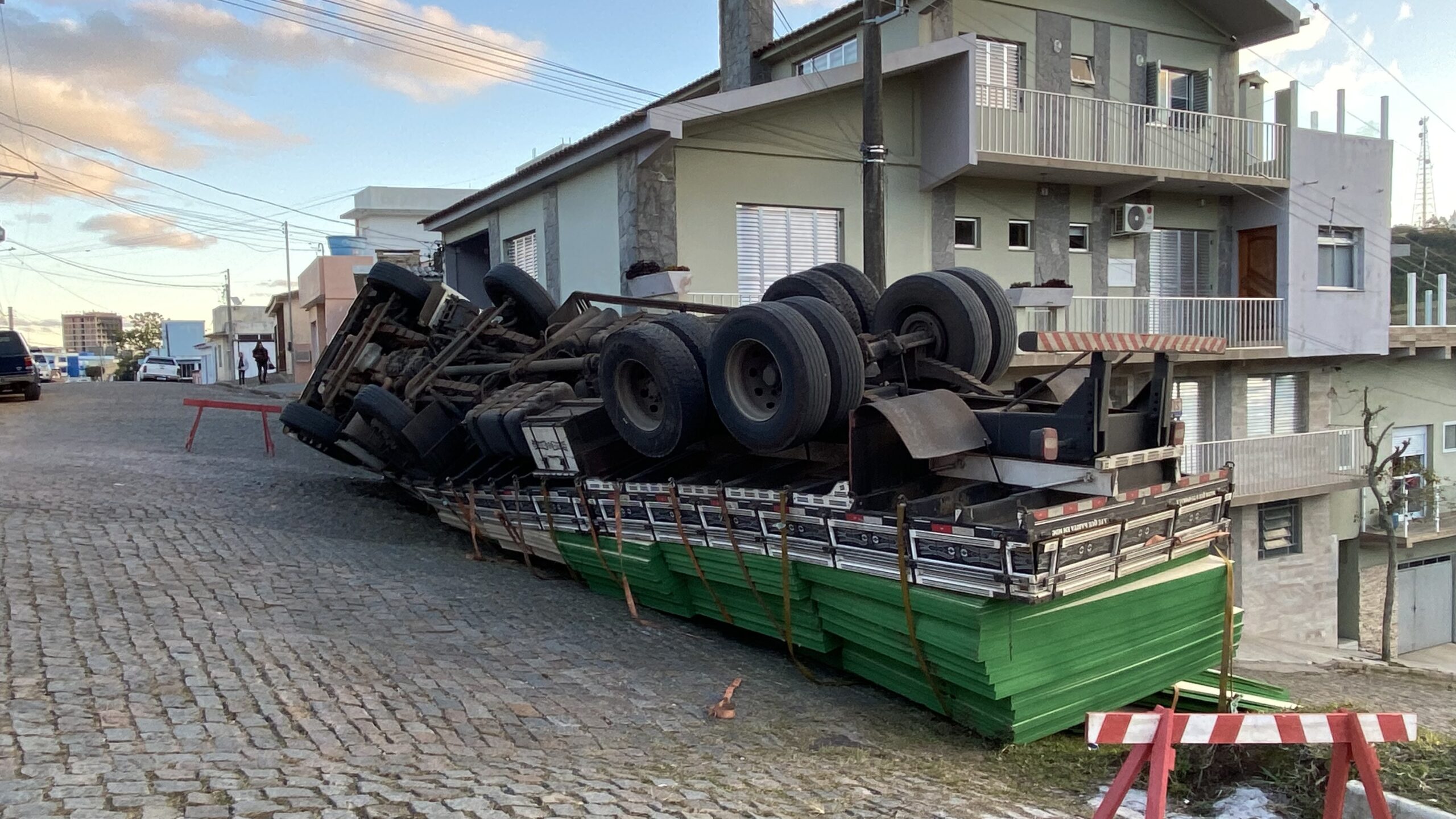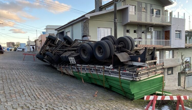 Na tarde desta segunda-feira (30), um caminhão bitruck carregado com placas de MDF virou no cruzamento das ruas Almirante Barroso com Franklin Máximo Moreira, nas proximidades da Cacimba do Ouro, em Canguçu.