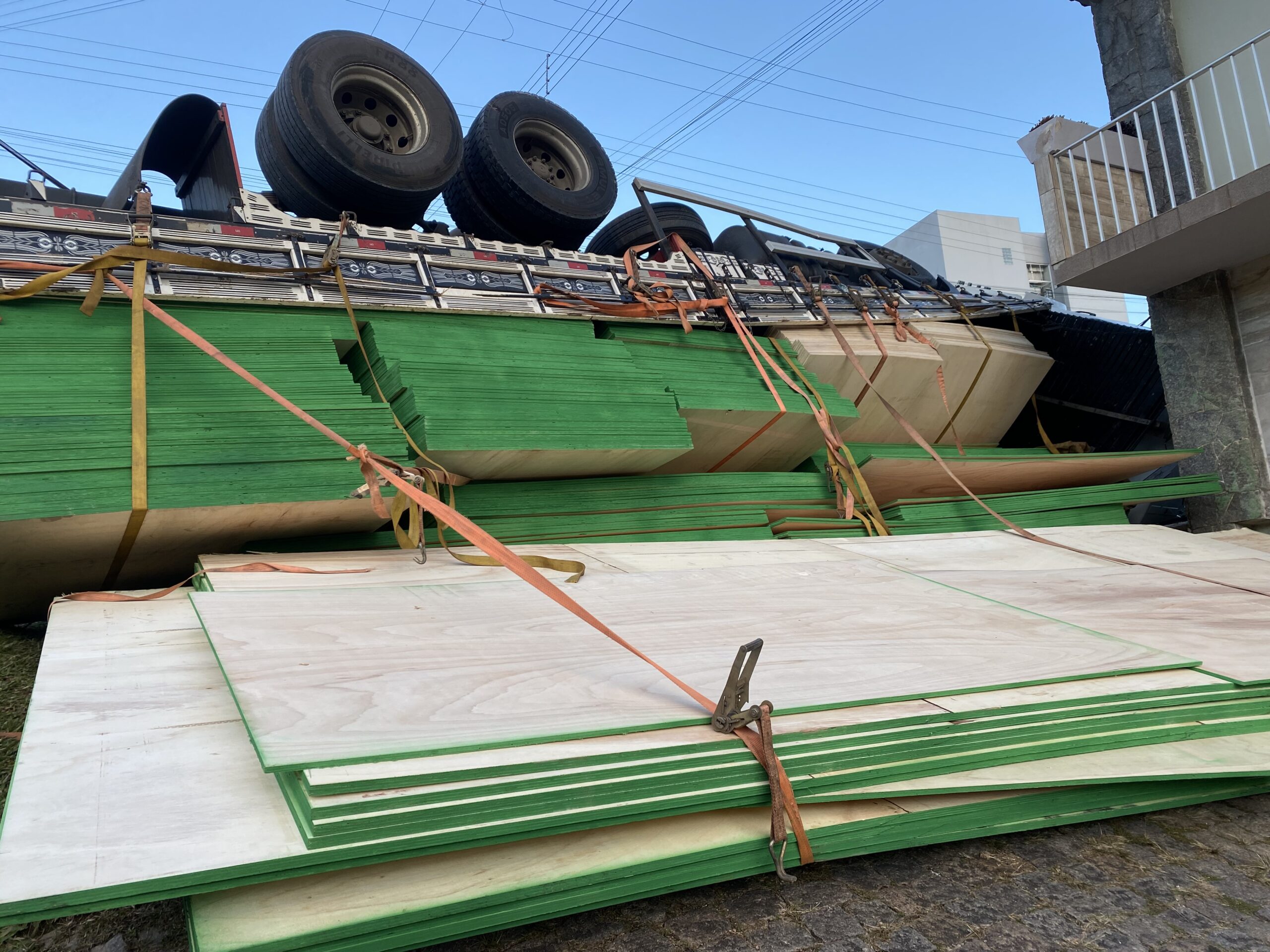 Veículo transportava placas de MDF; não houve feridos e o trânsito está isolado no local