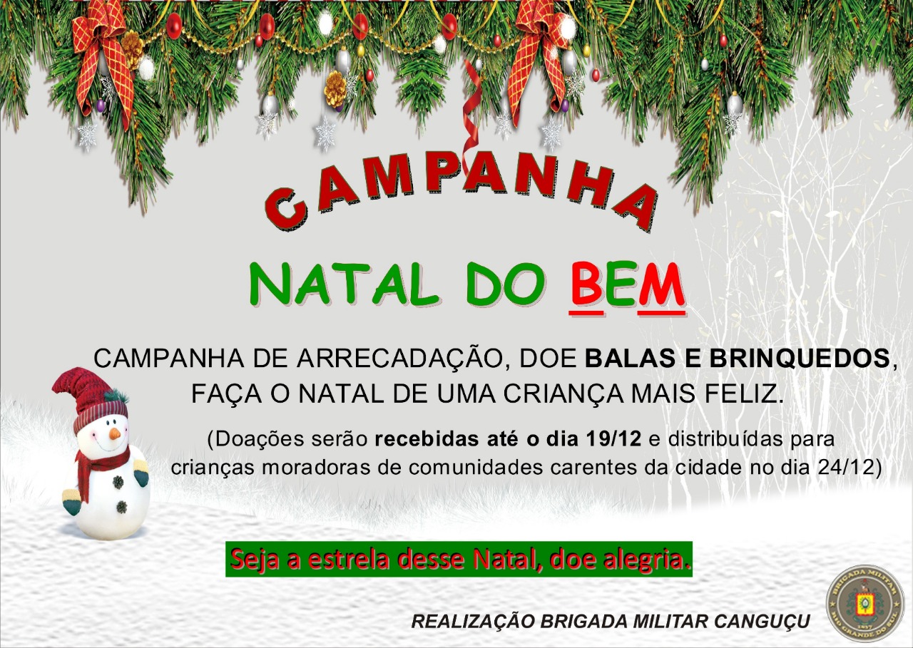 O efetivo que compõe a 4° Cia do 4° BPM iniciou a campanha Natal do Bem, a qual se encerra nesta quinta-feira (19), e tem como intento arrecadar brinquedos e doces para serem entregues nas áreas de maior incidência criminal de Canguçu.