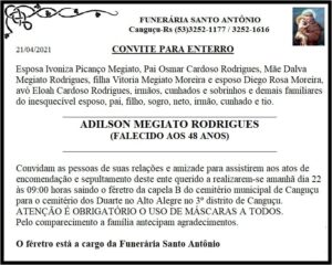 Nesta quarta-feira (21), o servidor público Adilson Megiato Rodrigues faleceu em decorrência de problemas de saúde causados pela covid-19. Aos 48 anos, atuava na Prefeitura Municipal e possuía boa relação com a comunidade canguçuense.