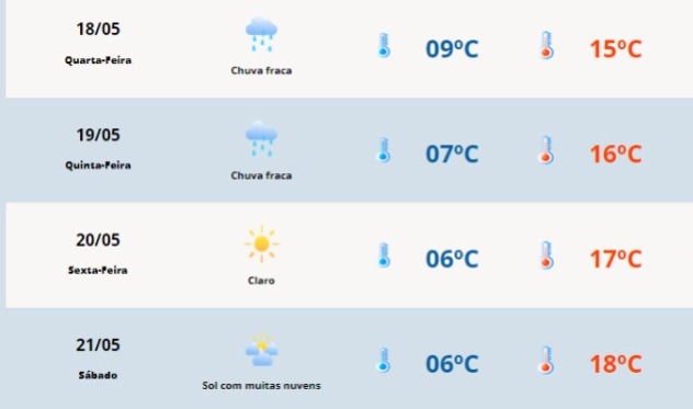 Canguçu deve registrar de 7°C a 16°C, na próxima quinta (19), conforme Metsul Meteriologia. O sol chegou a aparecer em alguns momentos na tarde desta quarta (18), mas a maior parte do dia foi nublado e chuvoso no município.