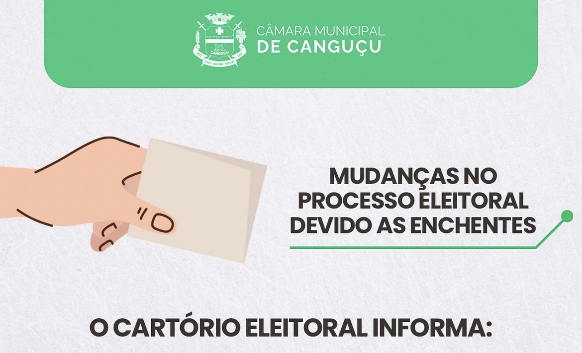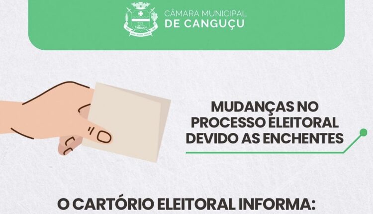 O Cartório Eleitoral de Canguçu informou, na quarta-feira (8), através das redes sociais da Câmara de Vereadores, algumas mudanças no processo eleitoral por conta das enchentes que atingem o Rio Grande do Sul.