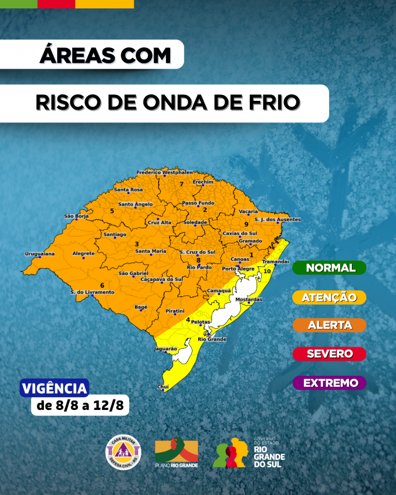 A Defesa Civil do Rio Grande do Sul emitiu um alerta para a forte massa de ar frio de origem polar que avança sobre o Estado e já começa a derrubar as temperaturas a partir desta sexta-feira (08). O município de Canguçu está entre as áreas inseridas na previsão de frio intenso, com potencial para geadas e mínimas negativas ao longo dos próximos dias.