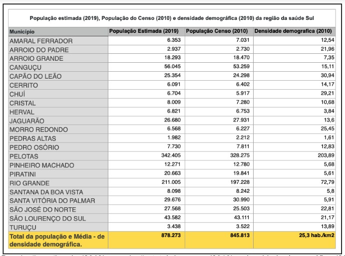 A presente analise possui como recorte espacial a Macrorregião Sul/Região de Saúde Sul (21)***, formada por 22 municípios (Pelotas, Rio Grande, Santa Vitória do Palmar, Capão do Leão, São Lourenço do Sul, Cerrito, Pedro Osório, Arroio Grande, Morro Redondo, Amaral Ferrador, Canguçu, Pinheiro Machado, Jaguarão, Herval, Chuí, Pedras Altas, Piratini, São José do Norte, Turuçu, Cristal, Arroio do Padre, Santana da Boa Vista) que juntos possuem uma população de 845.813 habitantes (2010), dos quais 83,5% da população vivem na zona urbana e 16,55 vive na zona rural (tabela 01).