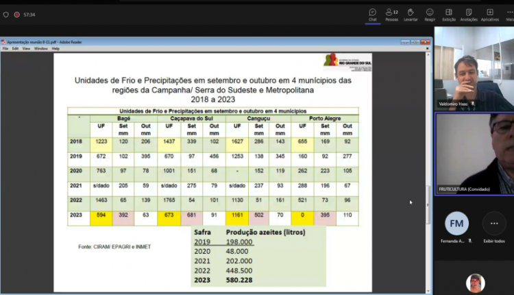 As condições para a próxima safra, as pesquisas conduzidas para a olivicultura no Estado e dados sobre a produção da safra 2023 foram os temas tratados durante a reunião da Câmara Setorial da Olivicultura nesta quarta-feira (08/11). O encontro integrou a programação do 28º Congresso Brasileiro de Fruticultura, que ocorre em Pelotas até sexta-feira (10/11), sendo realizado de forma híbrida pela Secretaria da Agricultura, Pecuária, Produção Sustentável e Irrigação (Seapi).