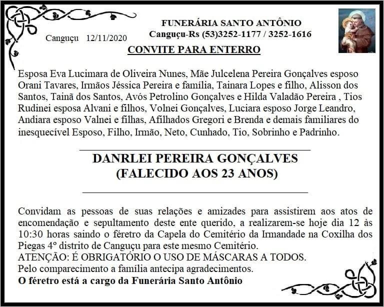 Danrlei será sepultado na manhã desta quinta-feira (12), às 10h30, saindo da Capela do Cemitério da Irmandade na Coxilha dos Piegas, 4º Distrito, para o mesmo cemitério. Na nota de falecimento, emitida pela Funerária Santo Antônio, são mencionados a esposa, pais, irmãos, cunhados, avós, tios e demais familiares.