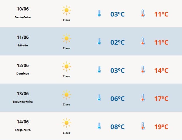 Neste final de semana, a geada deve permanecer durante a manhã, em diversas localidade do interior do município. Apesar das baixas temperaturas, a Metsul Meteorologia informa que não deve chover nos próximos dias. a sensação térmica pode ser de temperaturas mínimas negativas e de geadas durante a manhã.