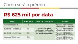 A proposta prevê R$ 1,25 milhão, divididos em duas datas: R$ 625 mil no dia 20 de julho e outros R$ 625 mil em 20 de agosto. A premiação será repassada aos municípios que, proporcionalmente, mais vacinarem, de acordo com o número de doses aplicadas e registradas no Sistema de Informações do Programa Nacional de Imunizações (SIPNI) sobre o número de doses distribuídas, em cada um dos quatro portes: acima 100 mil habitantes, de 99.999 a 50 mil habitantes, de 49.999 a 10 mil habitantes e abaixo de 10 mil habitantes.