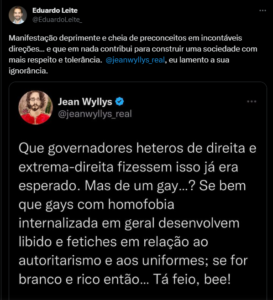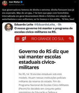 Em uma declaração controversa, o ex-deputado Jean Wyllys expressou seu desapontamento com a decisão do governador do RS. Jean Willys questionou a postura de Eduardo Leite e fez uma insinuação relacionada à homofobia internalizada, sugerindo que indivíduos gays com essas características podem desenvolver interesse e fetiches em relação ao autoritarismo e aos uniformes, especialmente se forem brancos e ricos.