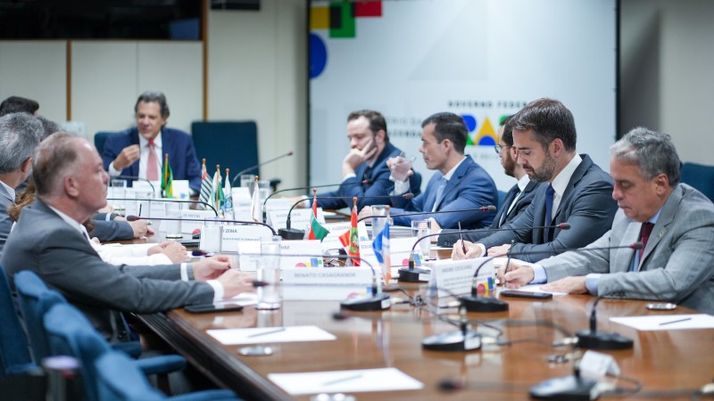 O governador Eduardo Leite, acompanhado pela secretária estadual da Fazenda, Pricilla Santana, participou, na manhã desta terça-feira (26/3), de reunião entre o ministro da Fazenda, Fernando Haddad, e os chefes dos executivos estaduais de Espírito Santo, Minas Gerais, Paraná, Rio de Janeiro, Santa Catarina e São Paulo. Na audiência os representantes do governo federal apresentaram uma proposta de renegociação da dívida dos Estados com União. A iniciativa, que agora será aprofundada pelas equipes técnicas, atrela uma redução nos juros do passivo à expansão do Ensino Técnico.