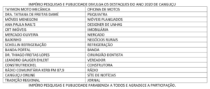 A empresa Império Pesquisas e Publicidade divulga os Destaques do ano de 2020 em Canguçu. O Canguçu Online (www.cangucuonline.com.br) foi escolhido na categoria “Site de Notícias”. Veja na imagem e na tabela abaixo as empresas que receberam a premiação: