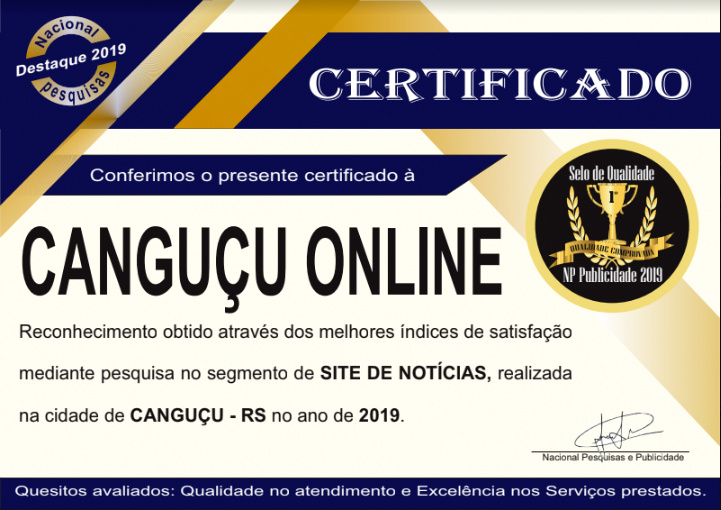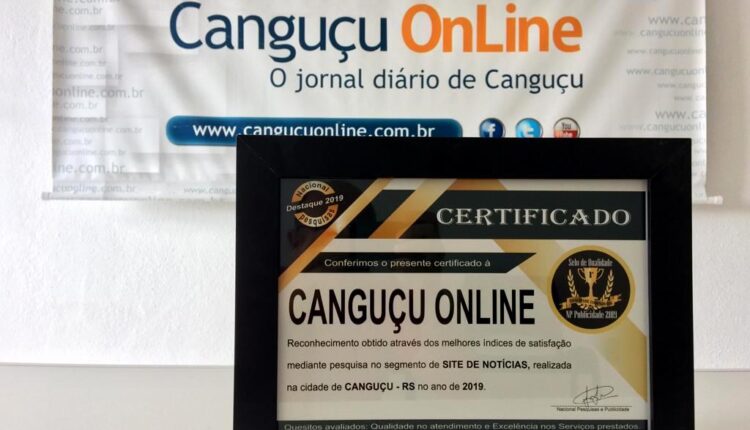 O site de notícias Canguçu Online (www.cangucuonline.com.br) atingiu este percentual de satisfação junto aos leitores e faz parte do seleto grupo de empresas que receberam o certificado de Destaque Empresarial e Selo de Qualidade 2019, com ênfase em Qualidade e Excelência.