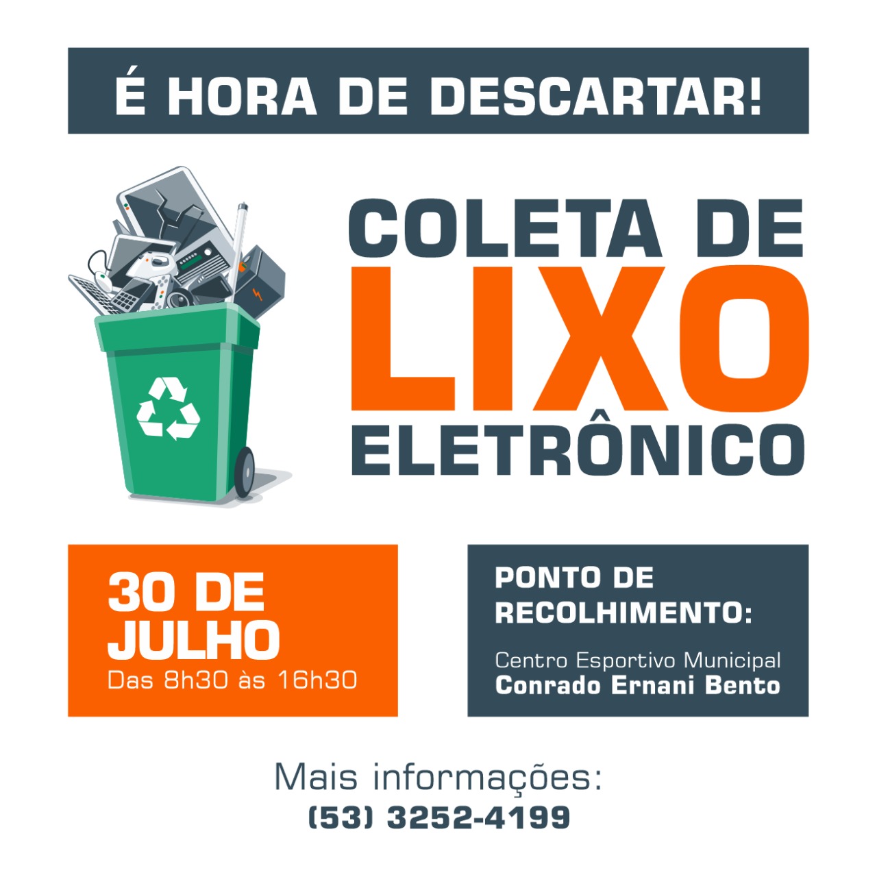 Nesta quinta-feira (30), a Prefeitura, através da Secretaria de Meio Ambiente e Urbanismo estará realizando mais uma coleta de lixo eletrônico. A coleta acontece novamente no Centro Esportivo Municipal Conrado Ernani Bento (Ginásio Municipal de Esportes) das 8h30 às 16h30h. Confira os materiais que serão recolhidos na campanha: – Caixas de som; – Desktop; […]