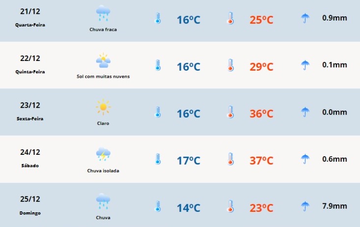 Na próxima quarta-feira (21), com o tempo úmido, o município deve registrar pancadas esparsas de chuva. Na quinta (22), existe a possibilidade de chover, mas o sol pode aparecer ao longo do dia. Já o natal além do tempo chuvoso, deve fazer 7,9mm de chuvas.