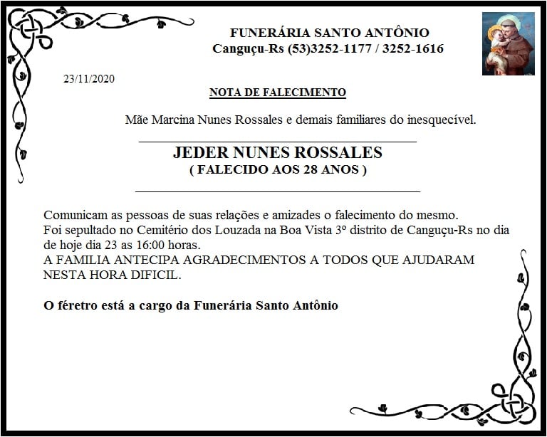 Na nota de falecimento emitida por volta das 18h15 da tarde desta segunda-feira (23), pela Funerária Santo Antônio, é mencionada a mãe do jovem, a senhora Marcina Nunes Rossales e demais familiares.
