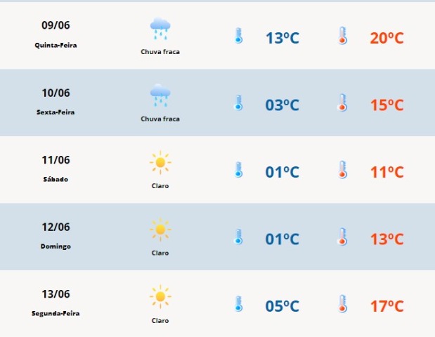 O domingo (12) ainda deve contar com geada de moderada a forte nas localidades do interior do município. Na segunda-feira (13), a sensação térmica pode ser de temperaturas mínimas negativas e de geadas durante a manhã. Por isso, é importante se proteger do frio e cuidar dos animais para que não sofram nos dias mais intensos.