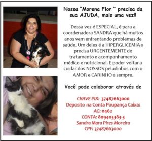 PEDIDO de AJUDAHá 15 anos a Sandra Coordena a ONG Amigos de Morena, que iniciou como um PROJETO de socorro a animais em situação de risco, fazendo o recolhimento, atendimento, castração e encaminhados a adoção.Porém com o passar desses anos, muitos problemas e dificuldades foram enfrentados por ela, juntamente com uma ação civil pública.Tais fatos levaram a coordenadora ao extremo, onde não conseguiu mais cuidar da sua saúde, visto que, tudo que ela conseguia em doações, foi destinado aos PELUDINHOS, deixando de lado suas necessidades básicas, devido à preocupação e dedicação que a coordenadora tem com esses animais.Além dos problemas adquiridos, debilidades (obesidade, estresse, depressão…) as quais a coordenadora já possuía, se agravaram muito.Preocupados com a saúde da nossa GUERREIRA SANDRA e com o futuro da causa animal, estamos promovendo essa CAMPANHA com intuito de arrecadar fundos para o tratamento médico dela.Toda AJUDA é BEM-VINDA.
