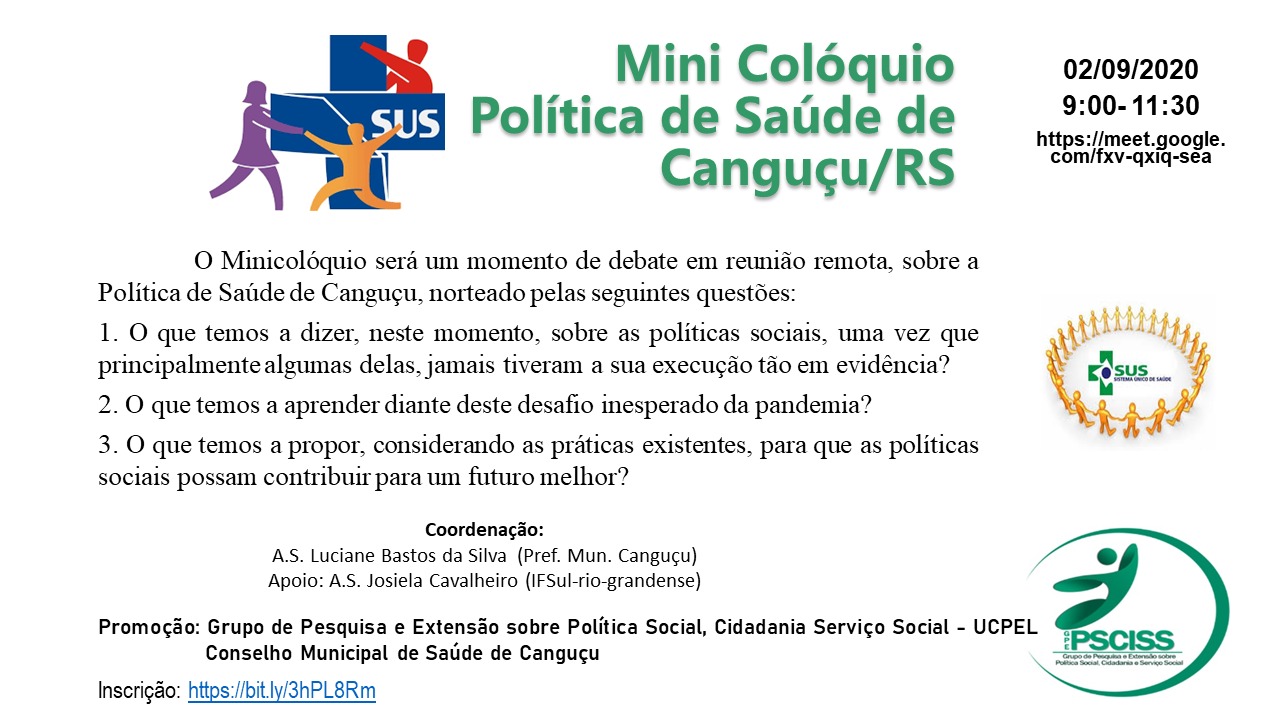 Nesta quarta-feira (2), das 9h30 às 11h30 acontecerá o Mini Colóquio Política de Saúde, um evento Online, com o objetivo de debater a saúde do município de Canguçu.